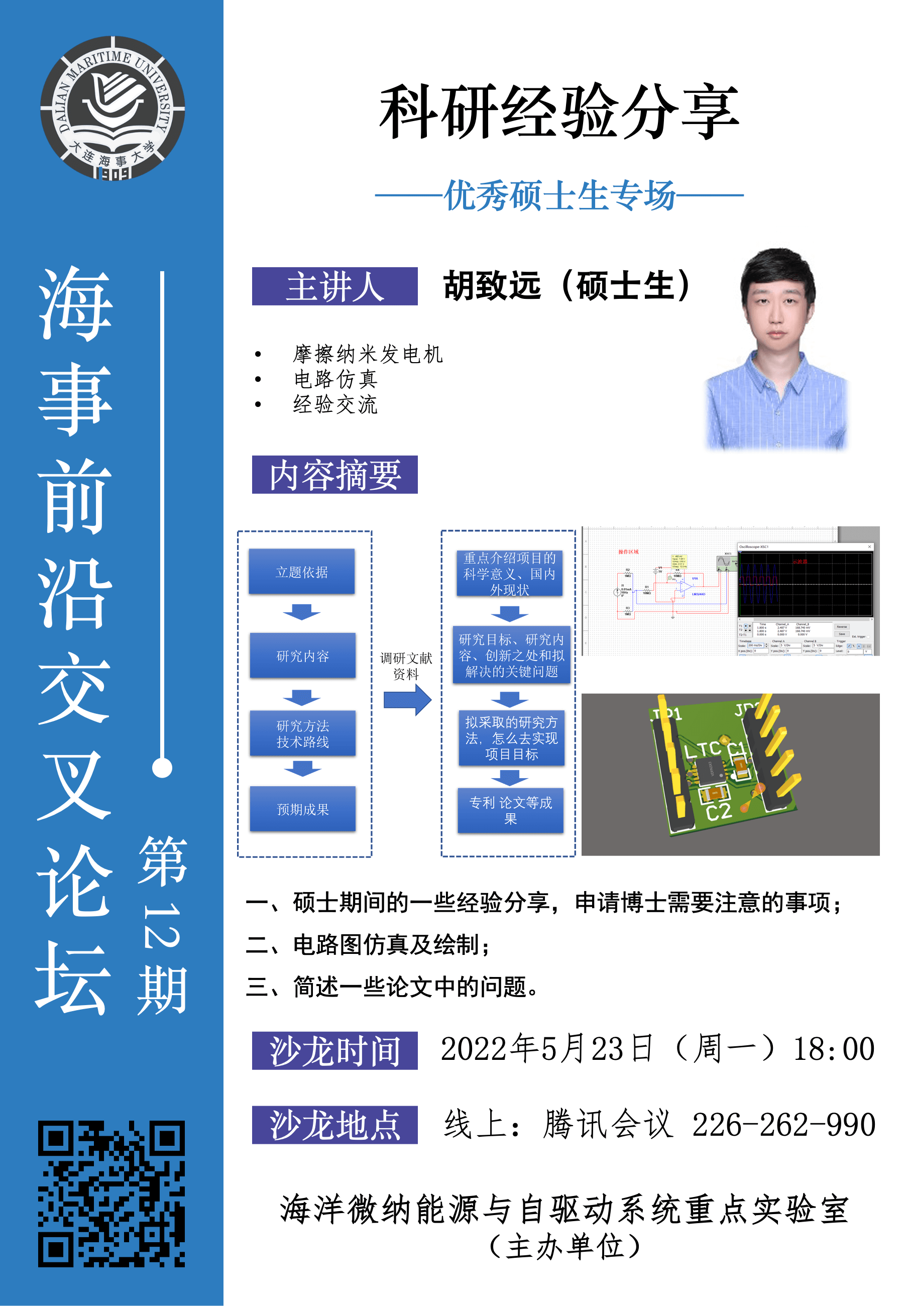 海事前沿交叉论坛第12期--优秀硕士生专场,由胡致远硕士生主讲,要点包括申请博士需要注意的事项、电路图仿真和绘制、科学论文中需要注意的问题。