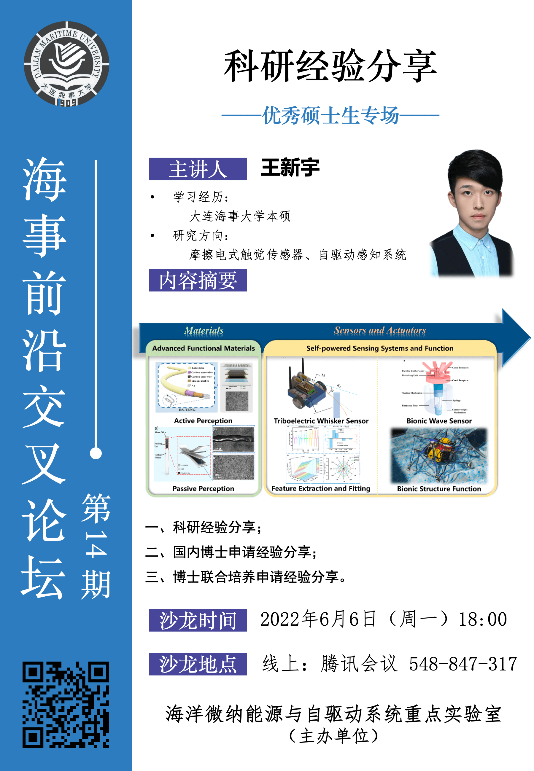 海事前沿交叉论坛第14期--优秀硕士生专场,由王新宇硕士生主讲,要点包括科研经验分享、国内博士申请经验分享和博士联合培养申请经验分享等。