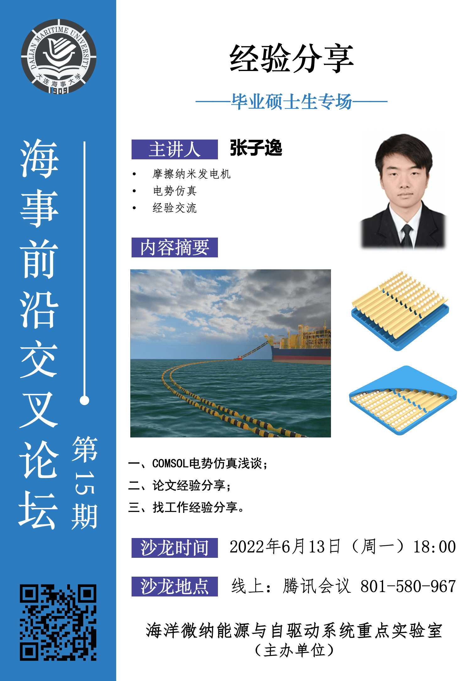 海事前沿交叉论坛第15期--毕业硕士生专场,由张子逸主讲,要点包括COMSOL电势仿真、科研经验、工作经验等。