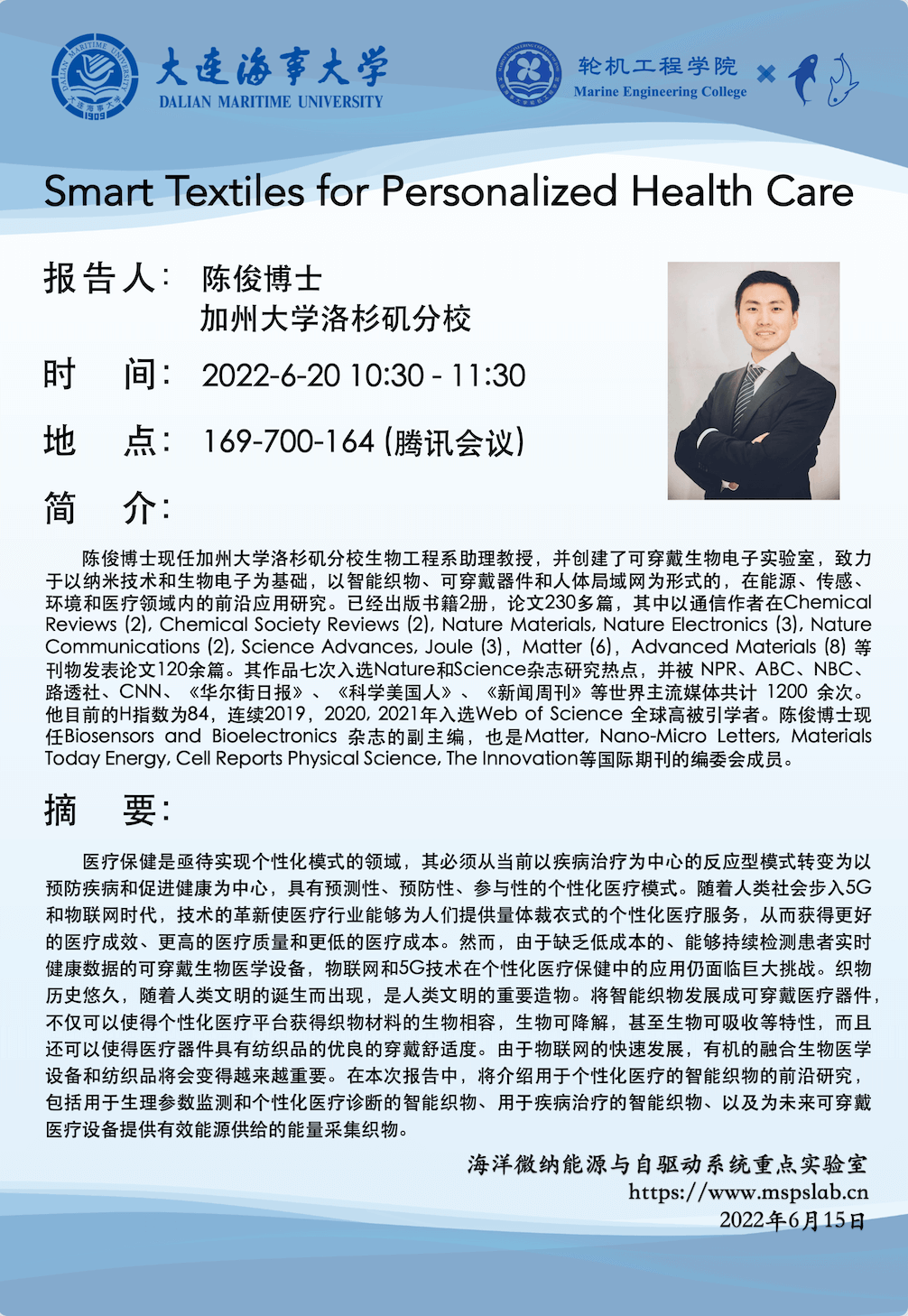 陈俊博士现任加州大学洛杉矶分校生物工程系助理教授,并创建了可穿戴生物电子实验室,致力于以纳米技术和生物电子为基础,以智能织物、可穿戴器件和人体局域网为形式的,在能源、传感、环境和医疗领域内的前沿应用研究。已经出版书籍2册,论文230多篇,其中以通信作者在Chemical Reviews (2), Chemical Society Reviews (2), Nature Materials, Nature Electronics (3), Nature Communications (2), Science Advances, Joule (3),Matter (6),Advanced Materials (8) 等刊物发表论文120余篇。其作品七次入选Nature和Science杂志研究热点,并被 NPR、ABC、NBC、路透社、CNN、《华尔街日报》、《科学美国人》、《新闻周刊》等世界主流媒体共计 1200 余次。他目前的H指数为84,连续2019,2020, 2021年入选Web of Science 全球高被引学者。陈俊博士现任Biosensors and Bioelectronics 杂志的副主编,也是Matter, Nano-Micro Letters, Materials Today Energy, Cell Reports Physical Science, The Innovation等国际期刊的编委会成员。