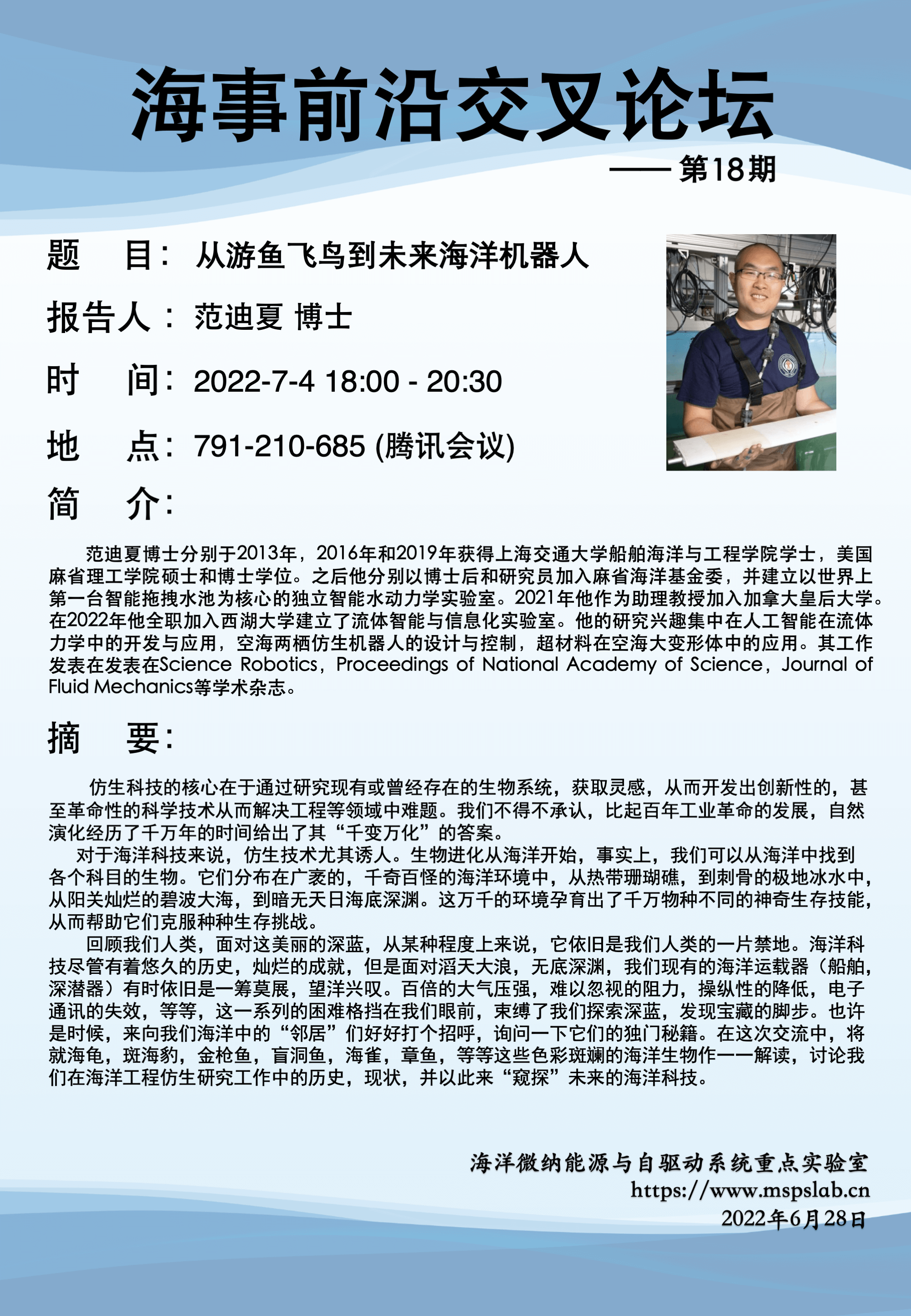 仿生科技的核心在于通过研究现有或曾经存在的生物系统,获取灵感,从而开发出创新性的,甚至革命性的科学技术从而解决工程等领域中难题。我们不得不承认,比起百年工业革命的发展,自然演化经历了千万年的时间给出了其“千变万化”的答案。对于海洋科技来说,仿生技术尤其诱人。生物进化从海洋开始,事实上,我们可以从海洋中找到各个科目的生物。它们分布在广袤的,千奇百怪的海洋环境中,从热带珊瑚礁,到刺骨的极地冰水中,从阳关灿烂的碧波大海,到暗无天日海底深渊。这万千的环境孕育出了千万物种不同的神奇生存技能,从而帮助它们克服种种生存挑战。回顾我们人类,面对这美丽的深蓝,从某种程度上来说,它依旧是我们人类的一片禁地。海洋科技尽管有着悠久的历史,灿烂的成就,但是面对滔天大浪,无底深渊,我们现有的海洋运载器(船舶,深潜器)有时依旧是一筹莫展,望洋兴叹。百倍的大气压强,难以忽视的阻力,操纵性的降低,电子通讯的失效,等等,这一系列的困难格挡在我们眼前,束缚了我们探索深蓝,发现宝藏的脚步。也许是时候,来向我们海洋中的“邻居”们好好打个招呼,询问一下它们的独门秘籍。在这次交流中,将就海龟,斑海豹,金枪鱼,盲洞鱼,海雀,章鱼,等等这些色彩斑斓的海洋生物作一一解读,讨论我们在海洋工程仿生研究工作中的历史,现状,并以此来“窥探”未来的海洋科技。