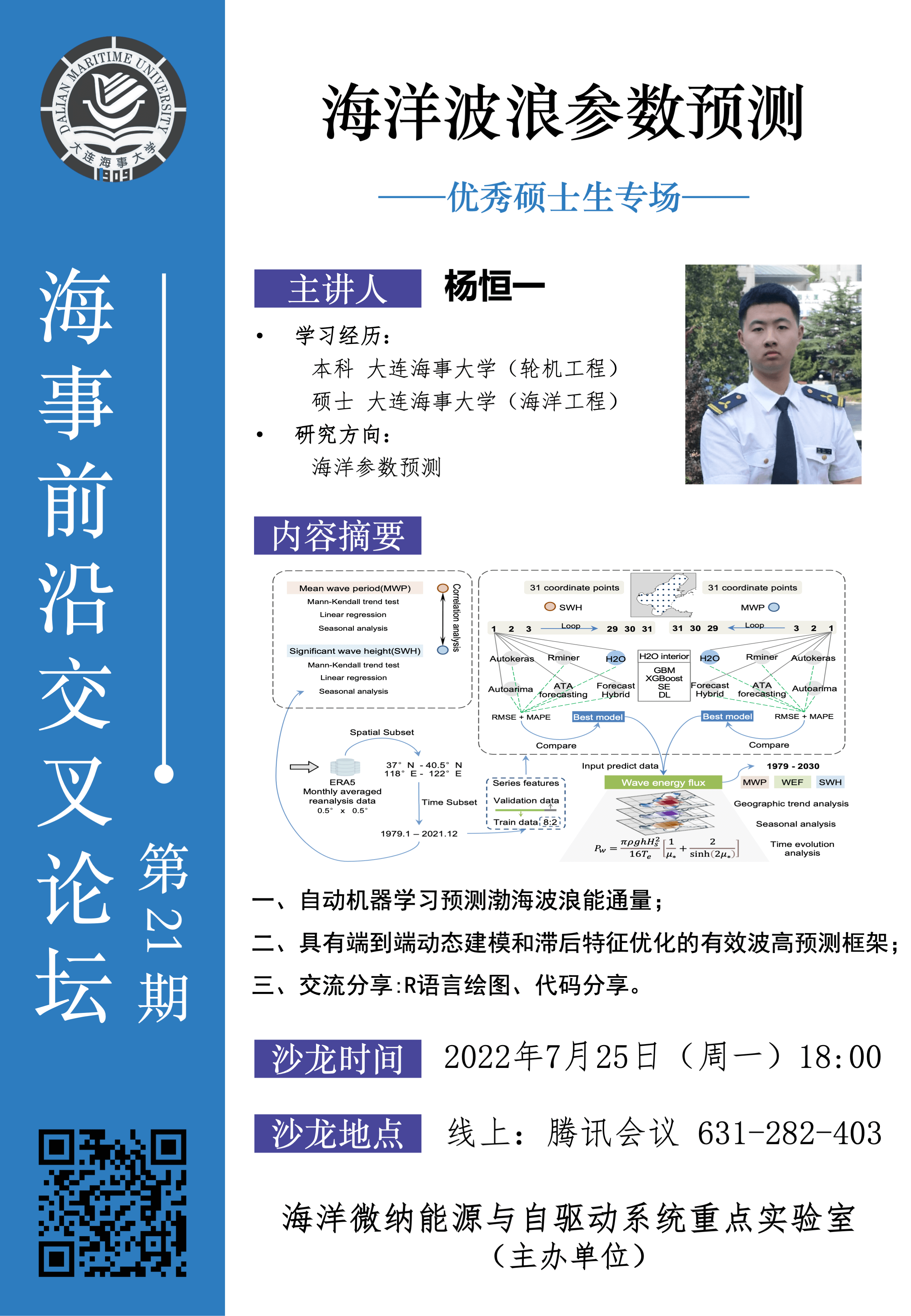 海事前沿交叉论坛第21期--优秀硕士生专场,由杨恒一主讲,要点包括机器学习在海洋波浪参数预测中的应用。