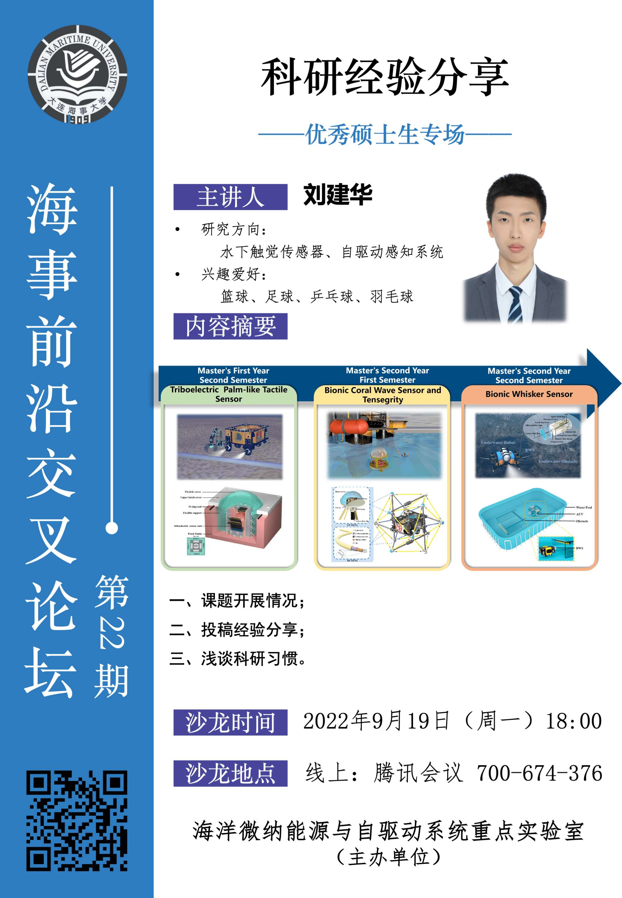 海事前沿交叉论坛第22期--优秀硕士生专场,由刘建华主讲,要点包括课题开展情况、投稿经验分享、科研习惯。