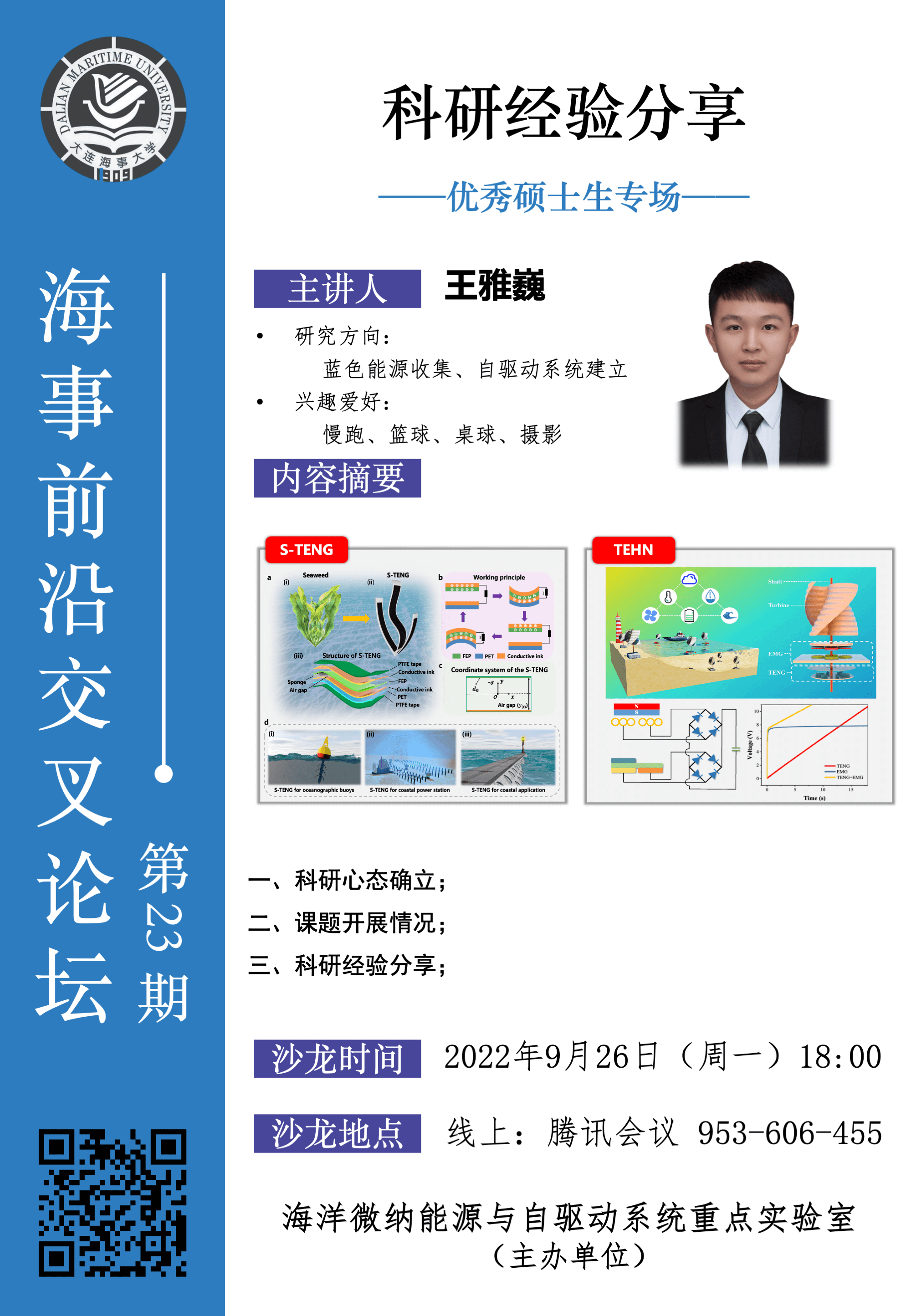 海事前沿交叉论坛第23期--优秀硕士生专场,由王雅巍主讲,要点包括科研心态确立、课题开展情况、科研经验分享。