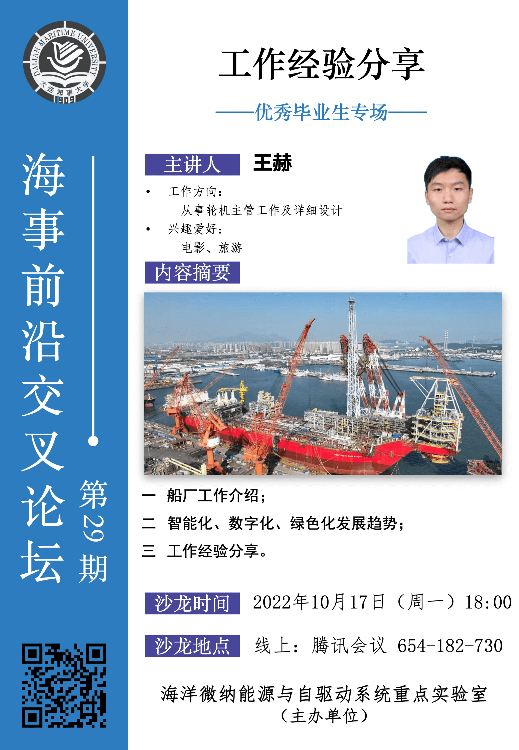 海事前沿交叉论坛第29期--优秀毕业生专场,由王赫主讲,要点包括船厂工作介绍、智能化、数字化、绿色化发展趋势和工作经验等。