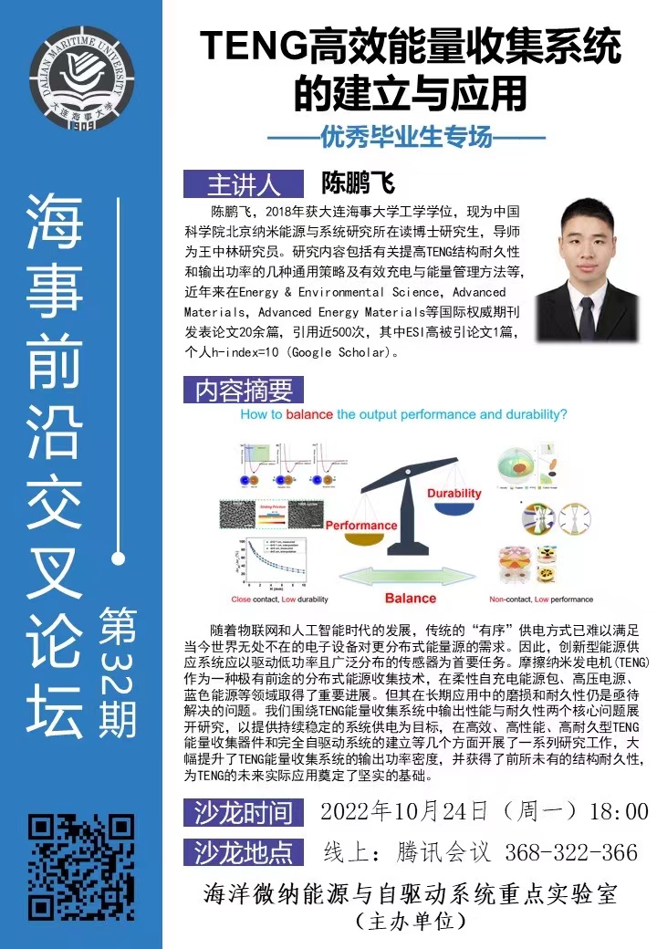 海事前沿交叉论坛第32期--优秀毕业生专场,由陈鹏飞主讲,围绕TENG能量收集系统中输出性能与耐久性两个核心问题展开介绍。