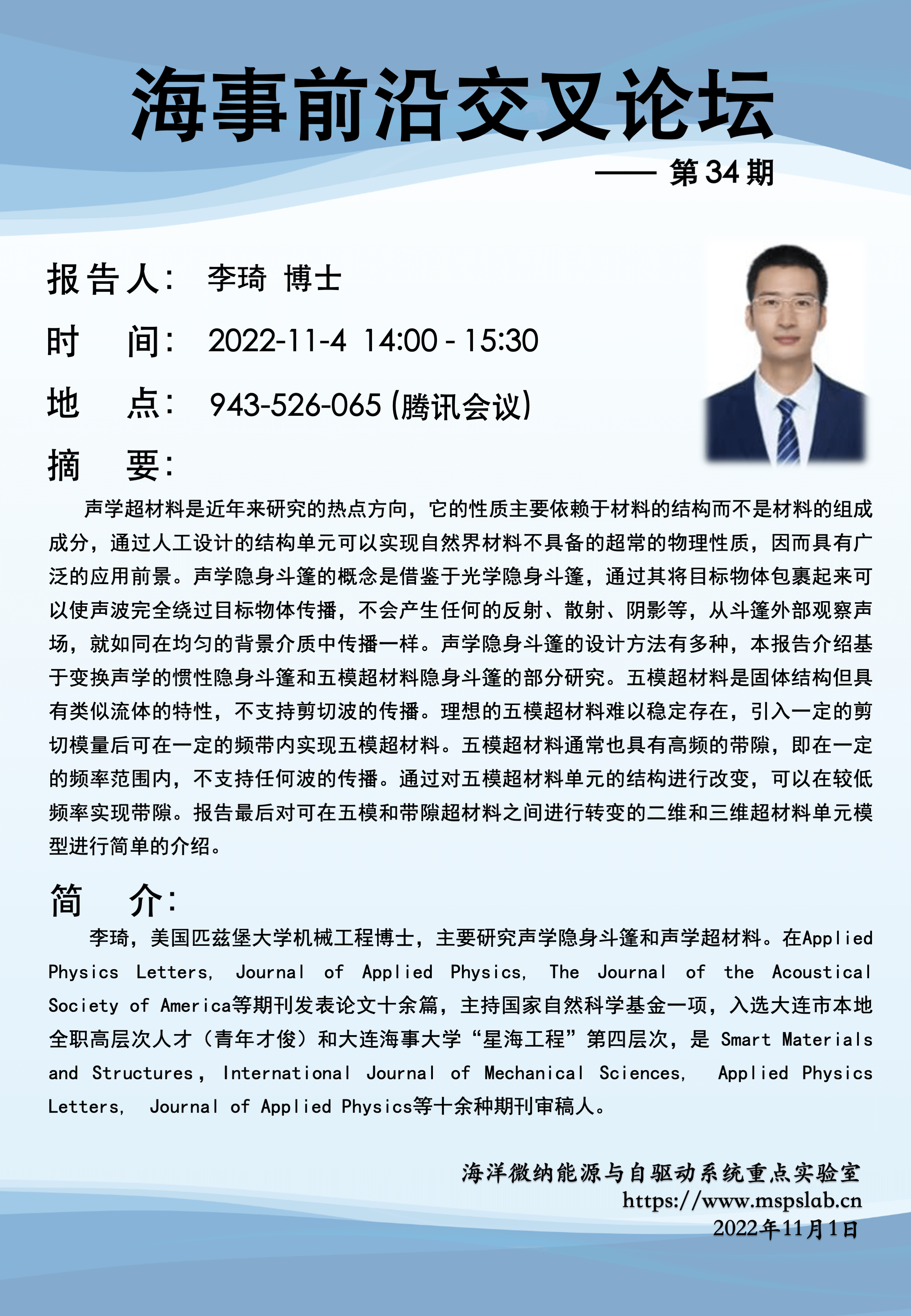 李琦,美国匹兹堡大学机械工程博士,主要研究声学隐身斗篷和声学超材料。在Applied Physics Letters, Journal of Applied Physics, The Journal of the Acoustical Society of America等期刊发表论文十余篇,主持国家自然科学基金一项,入选大连市本地全职高层次人才(青年才俊)和大连海事大学“星海工程”第四层次,是 Smart Materials and Structures,International Journal of Mechanical Sciences, Applied Physics Letters, Journal of Applied Physics等十余种期刊审稿人。