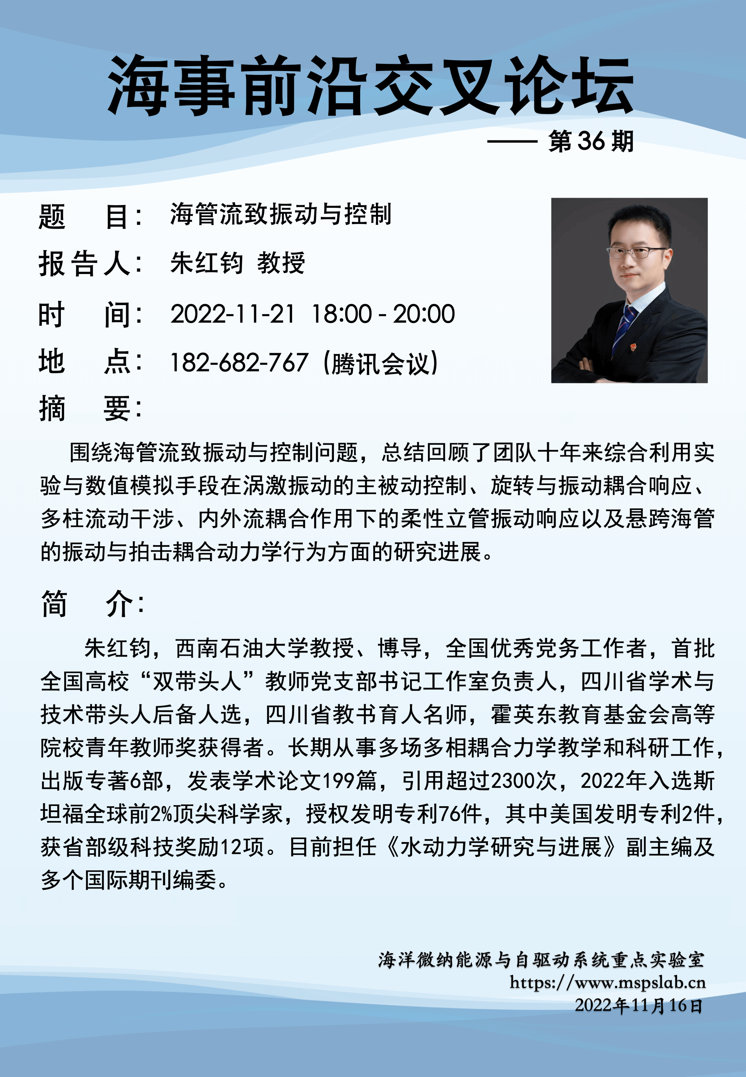 朱红钧,西南石油大学教授、博导,全国优秀党务工作者,首批全国高校“双带头人”教师党支部书记工作室负责人,四川省学术与技术带头人后备人选,四川省教书育人名师,霍英东教育基金会高等院校青年教师奖获得者。长期从事多场多相耦合力学教学和科研工作,出版专著6部,发表学术论文199篇,引用超过2300次,2022年入选斯坦福全球前2%顶尖科学家,授权发明专利76件,其中美国发明专利2件,获省部级科技奖励12项。目前担任《水动力学研究与进展》副主编及多个国际期刊编委。