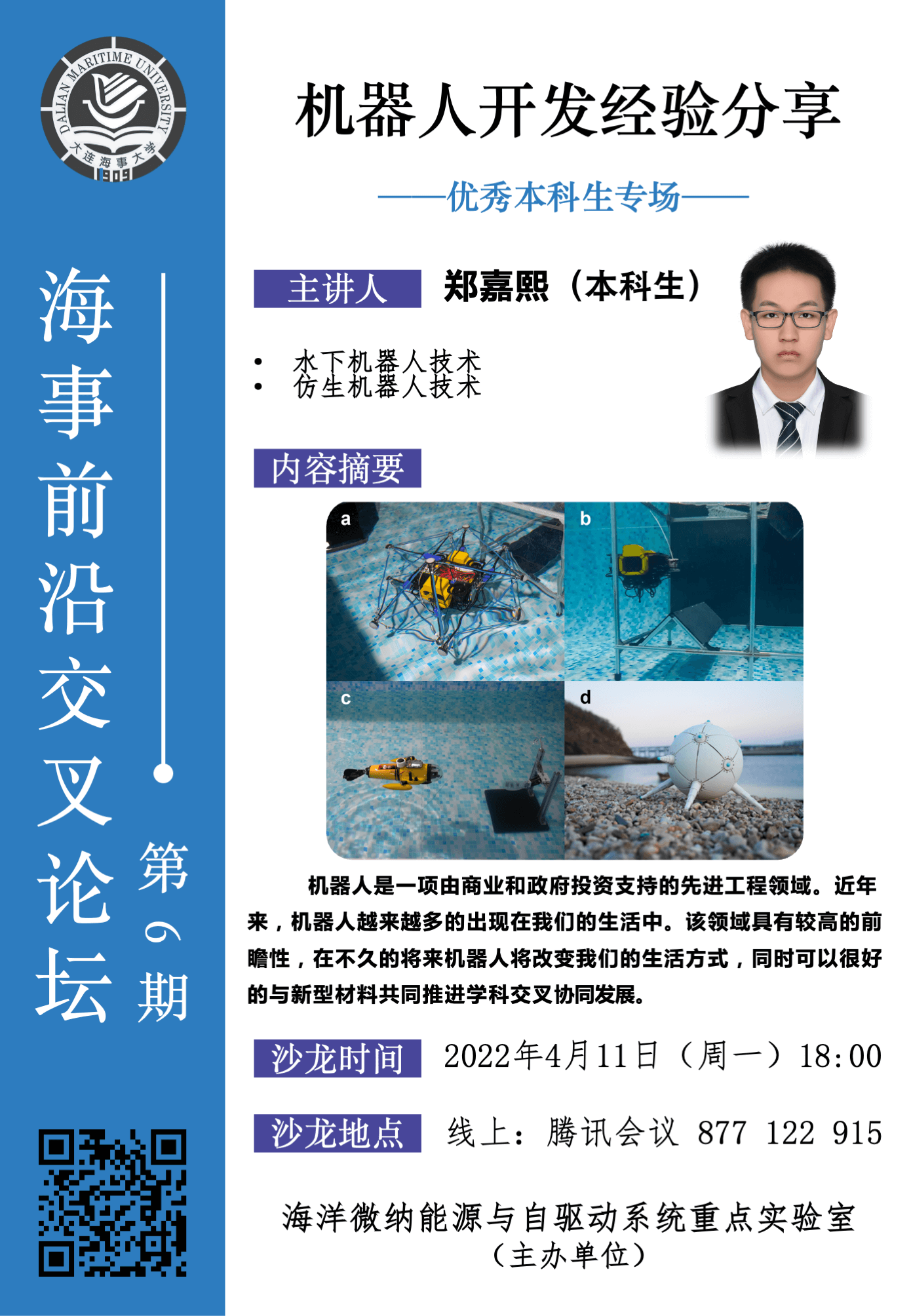海事前沿交叉论坛第6期--优秀本科生专场,由郑嘉熙本科生主讲,要点包括:机器人概述,水下机器人,仿生机器人和心得等。