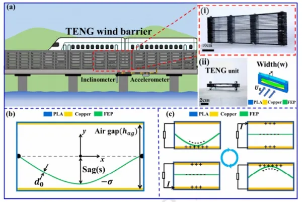 传统风屏障和新型风能采集装置的集成非常适合将风能转换为电能,同时又能保证车辆免受强风侵袭。在这项工作中,研究人员提出并研究了由大量摩擦电纳米发电机(TENG)单元集成的多功能风屏障。TENG单元由两个铜电极和一片氟化乙烯丙烯(FEP)膜组成,膜两端固定在3D打印的通道上。对TENG单元的结构进行优化后,用66个并联的TENG单元构成了TENG风屏障。研究发现风屏障在10 m / s的风速下可以产生高达440μA和26 mW的输出电流和功率。同时, TENG风屏障可以收集过往车辆引起的滑流的能量。更重要的是, TENG风屏障的挡风效率比传统的多孔式风屏障高了35%,这大大提高了车辆的安全性。此外,风屏障的每个TENG单元都可以用作自供能风速计,以监测风屏障的工况。因此,本研究中的新型风屏障具有巨大的潜力,可应用于风能的采集,自供能风速传感和更加高效的挡风。该成果发表在国际著名期刊Nano Energy上,文献链接:Multi-functional wind barrier based on triboelectric nanogenerator for power generation, self-powered wind speed sensing and highly efficient windshield. Nano Energy, 2020, DOI: 10.1016/j.nanoen.2020.104736. 大连海事大学轮机工程学院博士研究生王岩、硕士研究生王建业、助理教授肖秀为论文共同第一作者,大连海事大学轮机工程学院徐敏义教授与中南大学高速铁路建造技术国家工程实验室王汉封教授为共同通讯作者,广东海洋大学潘新祥教授,北京大学米建春教授,大连海事大学轮机工程学院博士研究生Phan Trung Kien、硕士研究生王思远、董家乐参与了本研究工作。该研究获得国家自然科学基金、中央高校基本科研业务费等项目的资助。