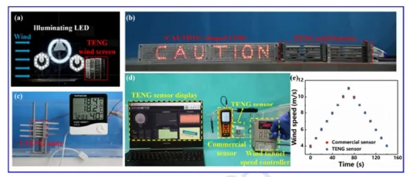 图6. TENG风屏障作为电源和传感器的演示 -(a-c)TENG风屏障点亮家用照明LED的照片,驱动“CAUTION”形状LED灯和温湿度传感器的照片(d)TENG传感器和商用传感器进行实时风速测量的照片(e)TENG传感器与商用风速传感器的比较