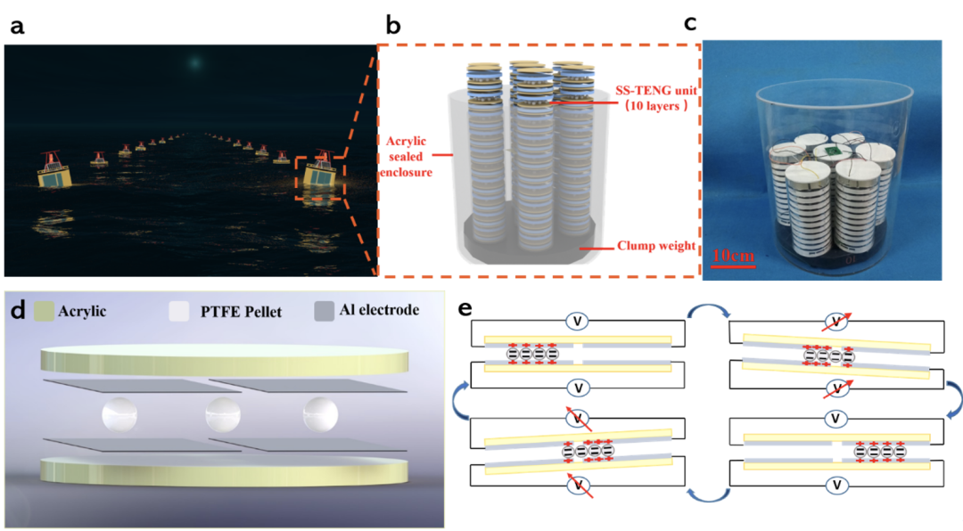 图1.自供能航标和摩擦纳米发电单元结构与应用场景 -(a)自供能航标的应用场景;(b)自供能航标的结构示意图;(c)自供能航标的实物照片;(d)三明治型摩擦纳米发电机的结构示意图;(e)三明治型摩擦纳米发电机的工作原理;