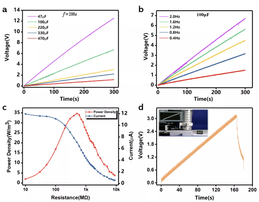 图3.10层堆叠发电单元的电容充电能力 -(a)2Hz频率下,10层堆叠发电单元不同规格电容充电对比;(b)不同频率条件下,10层堆叠发电单元对100μF电容充电对比;(c)10层堆叠发电单元的功率负载曲线图;(d)10层发电单元为温度传感器供电示意图;