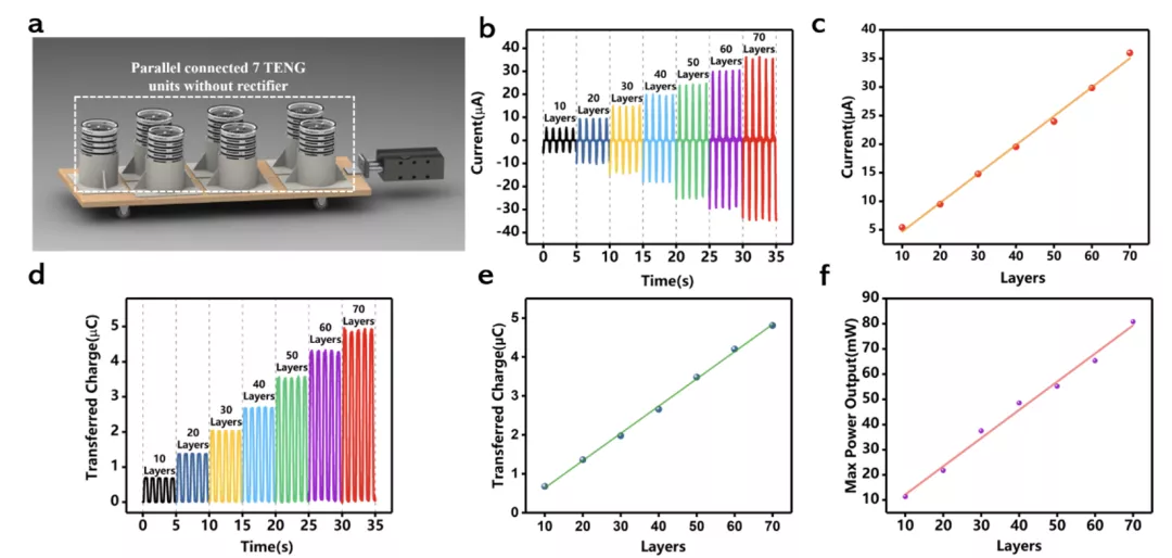 图4.7个10层堆叠发电单元的并联输出特性 -(a)多发电单元并联性能测试实验台示意图;(b)随并联单元数增加,短路电流变化数据图;(c)随并联单元数增加,短路电流变化趋势图;(d)随并联单元数增加,转移电荷量变化数据图;(e)随并联单元数增加,转移电荷量变化趋势图;(f)随并联单元数增加,最大输出功率变化趋势图;