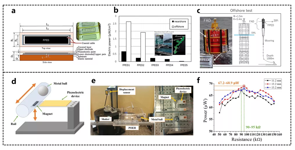 图9:(a)-(c) 一种用于海洋能量采集的柔性压电装置。(d)-(f)基于摇摆运动的压电海浪能量收集装置设计