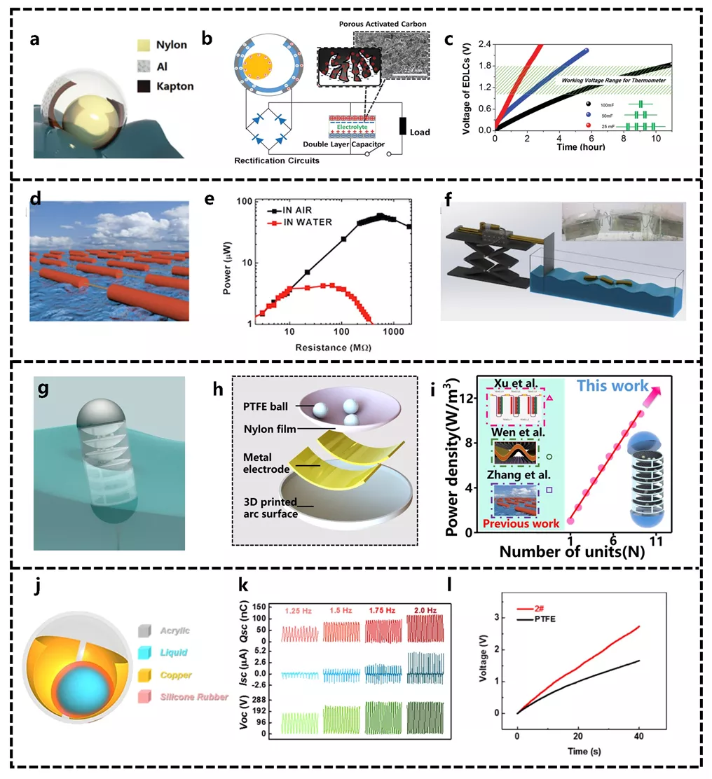 图11:(a)-(c) 基于全封闭滚动球结构的摩擦纳米发电机用于采集低频波浪能。(d)-(f)基于海蛇结构的摩擦纳米发电机,以最小化水屏蔽效应高效地收集海浪能量。(g)-(i) 用于采集任意方向波浪能量的高功率密度塔状摩擦纳米发电机 (j)-(l) 通过软接触结构有效收集波浪能量的摩擦纳米发电机