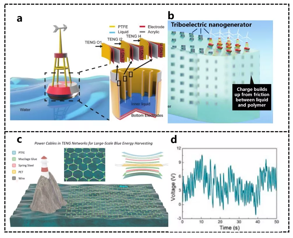 图12:(a)-(b)基于液固界面接触带电的高性能摩擦纳米发电机网络用于收集低频蓝色能量(c)-(d) 用于大规模蓝色能量收集的摩擦纳米发电机网络的电缆。