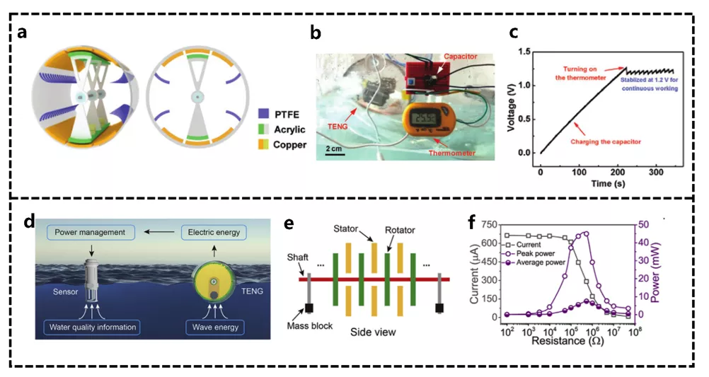 图13: (a)-(c) 基于坚固的摆动结构式摩擦纳米发电机用于蓝色能量高效采集。(d)-(f) 用于自供电、原位和实时水质测绘的高性能摩擦纳米发电机。