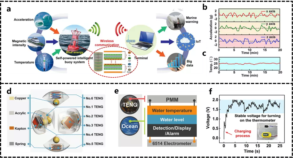 图14:(a)-(c) 基于波浪能采集技术的自供电智能浮标系统,用于可持续和自主的无线传感和数据传输。(d)-(f) 集成电源管理模块的球状摩擦纳米发电机,用于收集多方向波浪能量。