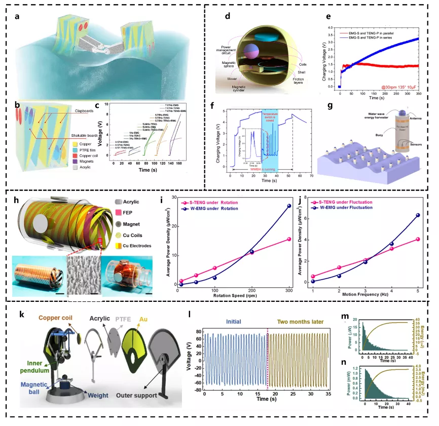图15:(a)-(c)用于高效采集波浪能的复合式纳米发电机。(d)-(g) 基于磁球的复合式摩擦电-电磁波浪能量收集装置。(h)-(j)基于摩擦电-电磁复合式能量采集技术的宽频响应纳米发电机。(k)-(n) 一种用于波浪能采集和自供电无线传感系统的混沌摆式摩擦电-电磁复合式纳米发电机