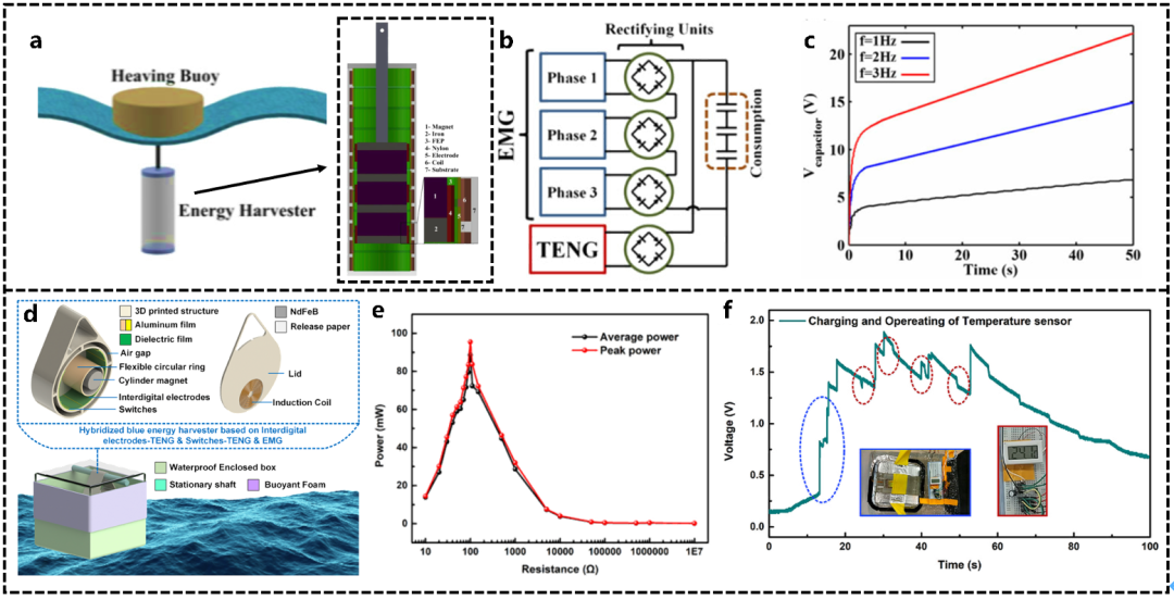 图16:(a)-(c)基于点吸收式的摩擦电-电磁复合波浪能采集装置。(d)-(f) 一种针对全天候物联网应用的新型复合式蓝色能量采集装置。