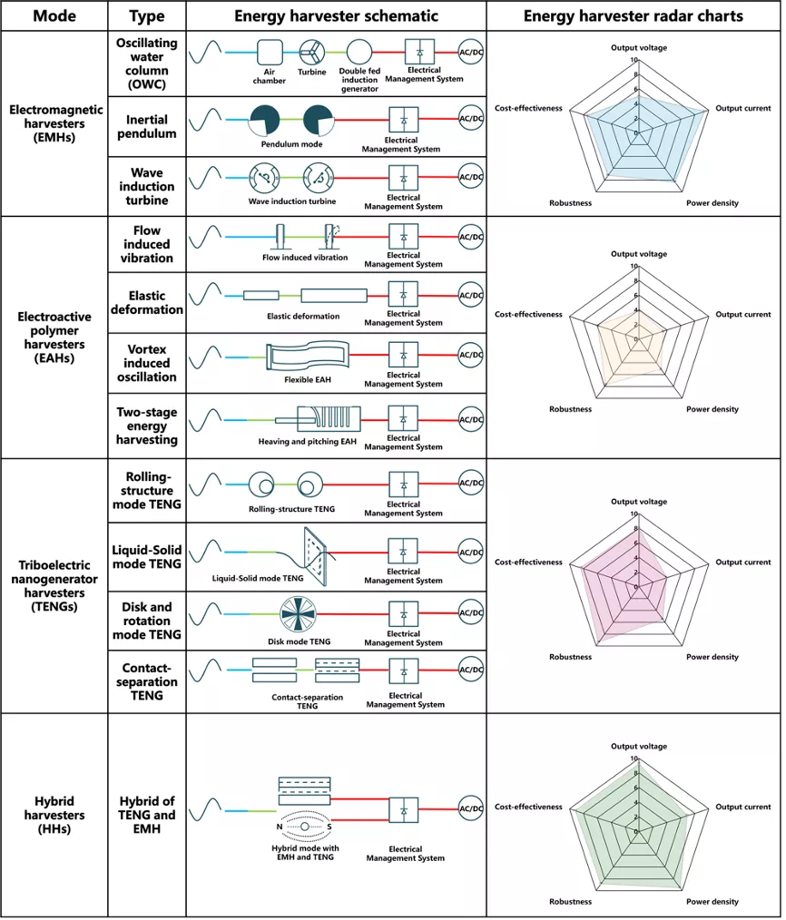 通过对比分析,如图17,TENG、EAH、HH 和大多数小型 EMH在流-机-电转换方面具有各自的优势。其中,TENG是收集低频、低幅度和随机方向的波能(称为高熵能)的有利方法。为了评估 OKEH 为分布式海洋传感装置供电的水平,已将五个关键特性设置为标准,包括输出电压、输出电流、功率密度、成本效益和稳健性。可以明显看出,HH结合了EMH和TENG的优点,是目前为海洋传感装置供电的理想采集装置。
