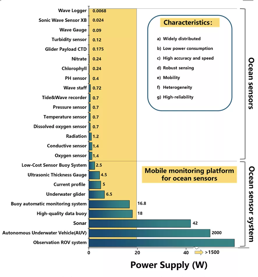 图 2 简要说明了目前较为先进的海洋商用监测设备或传感装置的能量需求。如今的主要目标是使传感装置节点能够在海洋中长时间运行。现有的技术阻碍了海洋传感装置的大规模部署,例如有限的电池能源和海生物附着。对于需要分布式、低功耗和高稳定性的设备,能量收集可能是最有效的方法。