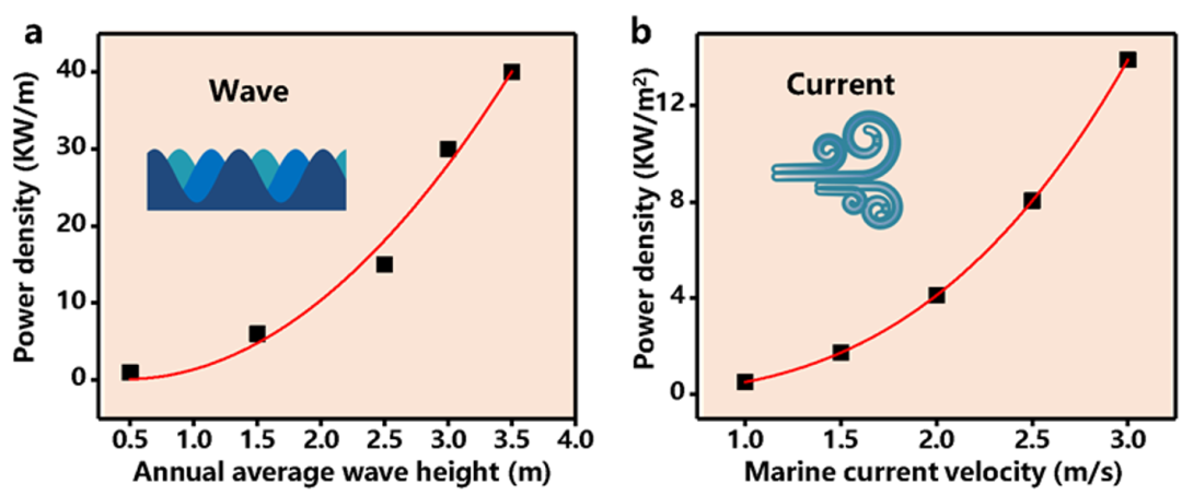 图3:(a) 不同波高的海浪和 (b) 不同流速的海流所对应的功率密度。