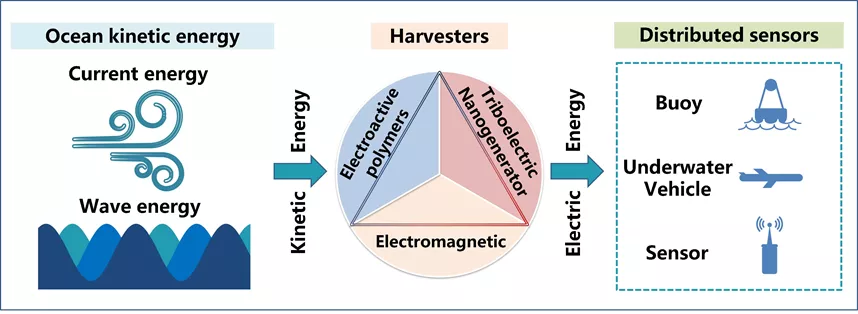 EAH 在利用 OKE 发电方面发挥着重要作用。按材料分类,EAH主要有3种类型;基于介电弹性体 (DE) 材料、压电(PE)材料和离子聚合物金属复合材料 (IPMC) 材料。在图8-10中,介绍了 EAH 在 OKE 收集中为分布式海洋传感装置供电的应用。
