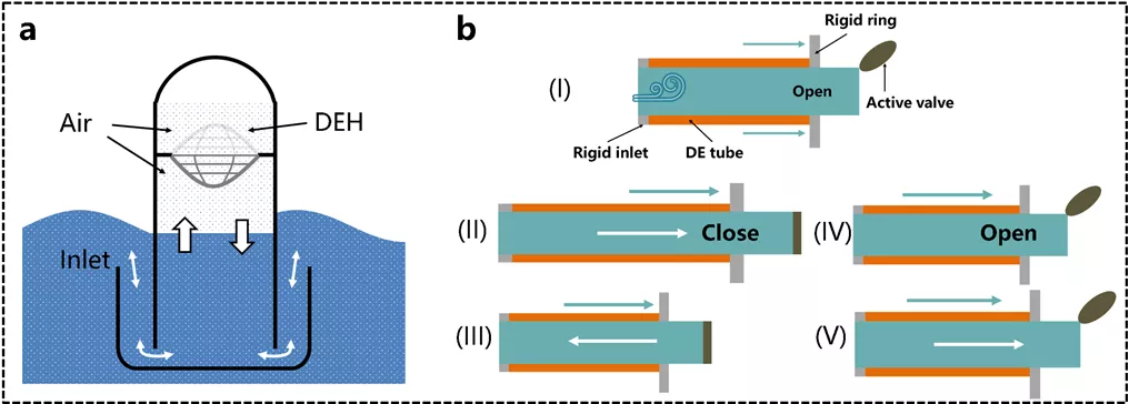 图8:(a)基于振荡水柱式的介电弹性体收集装置。(b) 基于介电弹性体的水流能发电装置。