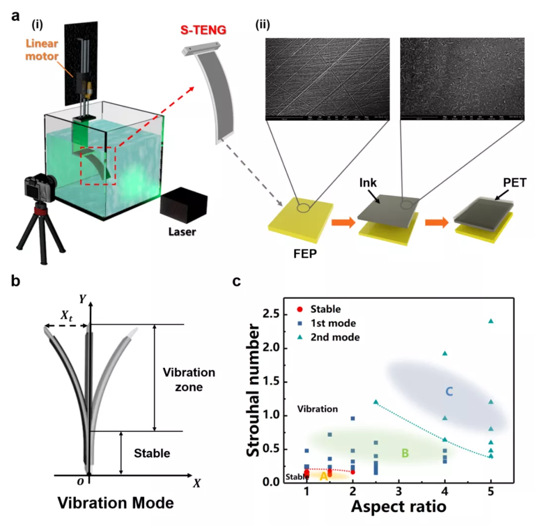 图2. S-TENG的实验装置和振动特性。(a)S-TENG实验装置和材料表面扫描电镜图;(b)S-TENG的振动模型;(c)S-TENG的模态分布图。