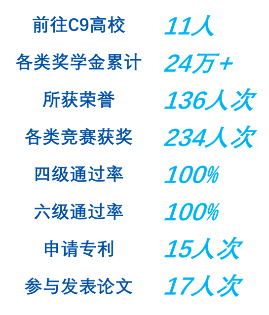 经过班级同学们的共同努力,大学三年班级同学平均绩点3.6,大学英语四六级通过率100%,且六级平均分500+。班级25名同学均保送至“双一流”高校,其中:11人保送C9高校,10人保送“国防七子”高校,22人保送至985高校,是历届实验班最好成绩!