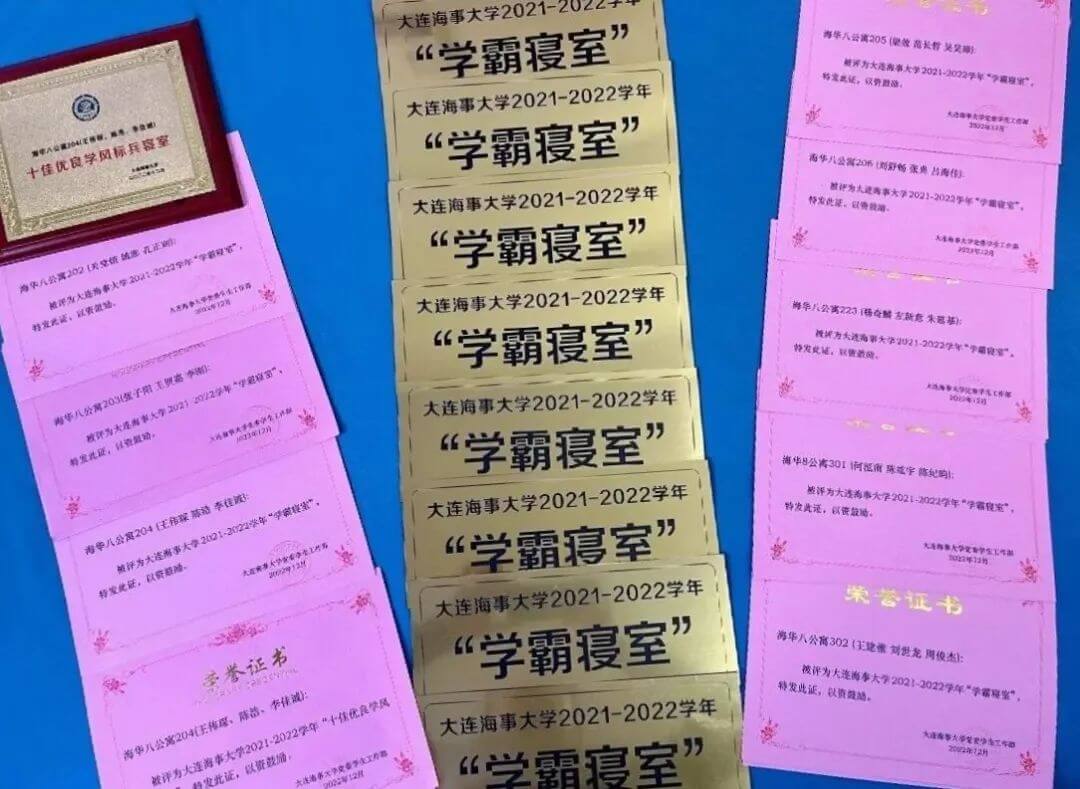 2021-2022年度,班级8个寝室获评校“学霸寝室”,其中1个寝室获评校“十佳优良学风标兵寝室”。卓越的成绩使得班级个人和集体至今共斩获奖学金超24万元。班级连续两年获评校三好区队,连续三年获评大连海事大学班级最高荣誉——优良学风标兵班。