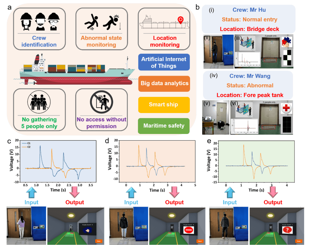 近日,大连海事大学徐敏义教授团队与新加坡国立大学李正国教授团队,上海交通大学杨卓青研究员团队展开合作,开发并研究了一种基于深度学习和摩擦纳米发电原理的自驱动智能地毯,以实现监控机组人员和未经授权的人员,并计算机舱内的人数。该智能地毯由多个基于摩擦电的智能地毯单元组成。每个智能地毯单元由导电海绵和氟化乙烯丙烯 (FEP) 膜制成。参考快速响应(QR)码系统设计了不同填充率的导电海绵电极。当人员踩在并联的智能地毯上时,可以产生可区分且稳定的信号。通过判断信号波峰的特征,可以实现人数统计。更重要的是,可以使用卷积神经网络(CNN) 模型从生成的信号中提取与步行步态模式相关的身份和状态信息。该成果以“Deep Learning-Assisted Triboelectric Smart Mats for Personnel Comprehensive Monitoring toward Maritime Safety” 为题发表在ACS Applied Materials & Interfaces 上。大连海事大学博士生王岩,硕士生胡致远、王俊鹏为论文共同一作。大连海事大学徐敏义教授、新加坡国立大学李正国教授和上海交通大学杨卓青研究员为该论文共同通讯作者。