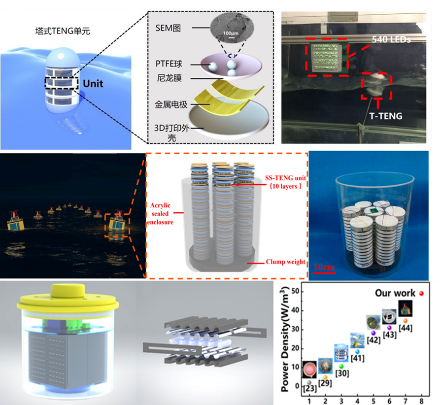 - 自供能浮标依托于王中林院士开创的摩擦纳米发电机技术(Triboelectric Nanogenerator, TENG),其通过摩擦起电和静电感应的耦合将机械能转换为电能。作为一种全新的机电转换方式,摩擦纳米发电机被“爱因斯坦世界科学奖”评审委员会认为是有望改变世界的前沿技术,可将低频、微弱机械能高效转化为电能,在环境能量收集、物联网、自驱动系统等领域有着广阔应用前景。
