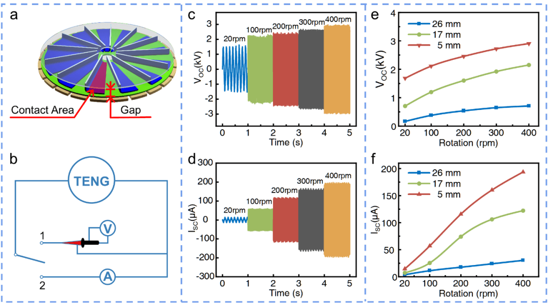 图2. FR-TENG的结构和电气特性。a)FR-TENG的结构示意图。b)FR-TENG电气特性的测量电路图。开关位置1和2分别对应FR-TENG的开路电压和短路电流的测量。不同转速下FR-TENG的c)开路电压和d)短路电流。FR-TENG各种间隙距离的e)开路电压和f)短路电流。