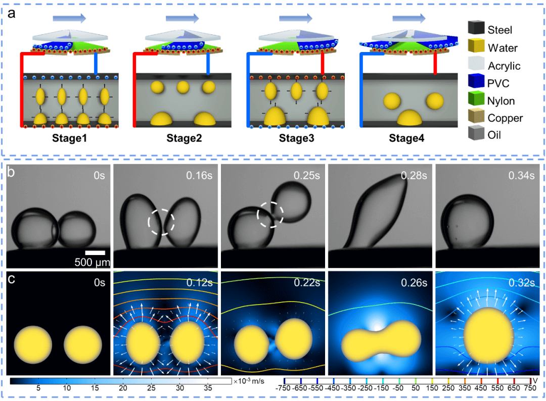 图3. FR-TENG构建的高压电场下乳液中水滴的运动状态。a)TED的一个完整周期中的四个阶段。b)实验和c)模拟条件下由FR-TENG直接驱动的水滴聚结。