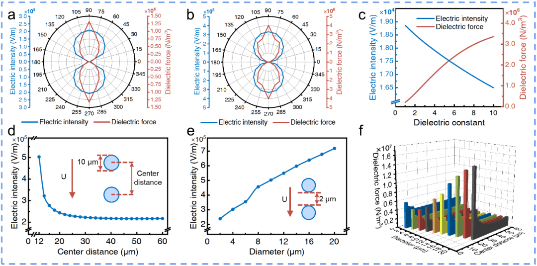 图 4.模拟不同条件下油包水乳液中的电场强度和介电力。a)围绕一个水滴和b)两个水滴之间不同角度下的电场强度和介电力的变化。c)介电常数与电场强度和介电力的关系。d)两个不同中心距的水滴之间的电场强度变化。e)两个不同直径的水滴之间的电场强度变化。f)不同直径的水滴在不同中心距离处的介电力变化。