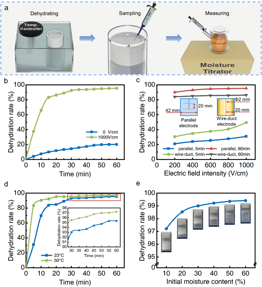 图5. 不同实验条件对TED电脱水性能的影响。a)电脱水实验过程示意图。b)与重力沉降相比,FR-TENG驱动的电场增强了脱水效果。c)在5分钟和60分钟时,不同平均电强度对两种电极结构的脱水速率的影响。d)通过提高乳液的温度促进脱水。e)最终脱水率随初始水分含量的不同而变化。