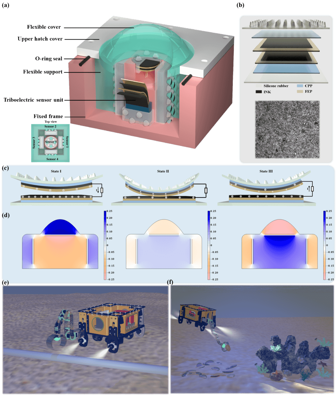 图1 TPTS结构、工作机理及应用。(a) TPTS的结构图。插图:传感器单元布局的俯视图。(b) 传感单元的结构图和FEP膜表面的SEM图像。(c) FEP膜与导电油墨接触分离过程中的电荷分布。(d) COMSOL软件模拟电位分布。(e) TPTS在管道无损检测中的应用。 (f) TPTS在水下自主目标抓取中的应用。