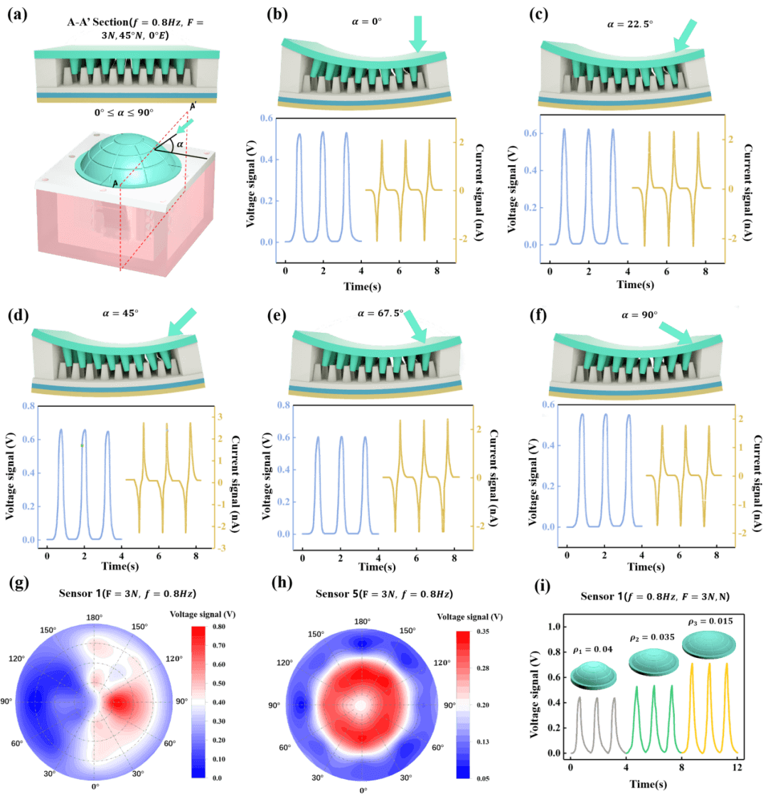 图3 不同荷载方向和位置下TPTS的响应特性。(a)摩擦电感测单元1的初始状态以及外部负载和水平线之间的角度α。(b)角度α= 0°时传感单元1的状态以及感应外部负载的开路电压和短路电流。(c)角度α= 22.5°时传感单元1的状态以及感应外部负载的开路电压和短路电流。(d)角度α= 45°时传感单元1的状态以及感应外部负载的开路电压和短路电流。(e)角度α= 67.5°时传感单元1的状态以及感应外部负载的开路电压和短路电流。(f)角度α= 90°时传感单元1的状态以及感应外部负载的开路电压和短路电流。(g)在F = 3 N、f = 0.8 Hz和α= 90°的条件下,感应单元1感应不同位置刺激的开路电压。(h)在F = 3 N、f = 0.8 Hz和α= 90°的条件下,感测单元5感应不同位置刺激的开路电压。(i)在F = 3 N、f = 0.8 Hz和α= 90°条件下感应不同曲率的柔性覆盖物的开路电压。