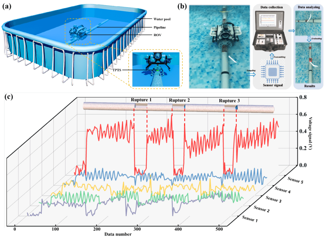 图4 无损水下管道评估实验。(a)水下管道无损检测中管道和传感器的配置。(b)从信号采样到无损水下管道评估的流程。(c)演示TPTS在水下管道无损评价中的应用及其相应的输出电压信号。
