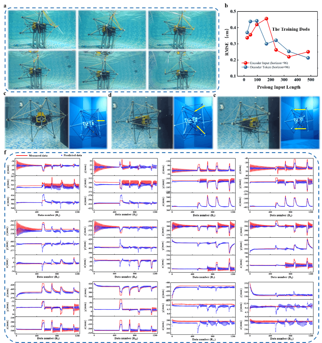 图 5. 深度学习辅助的水下触觉感知系统。(a) 通过挤压收集数据。(b) 输入长度的参数敏感性。(c)(d)(e) 实时传感中碰撞不同位置的演示。(f) 12个节点的位置预测(红线是实际数据,蓝点是预测数据)。