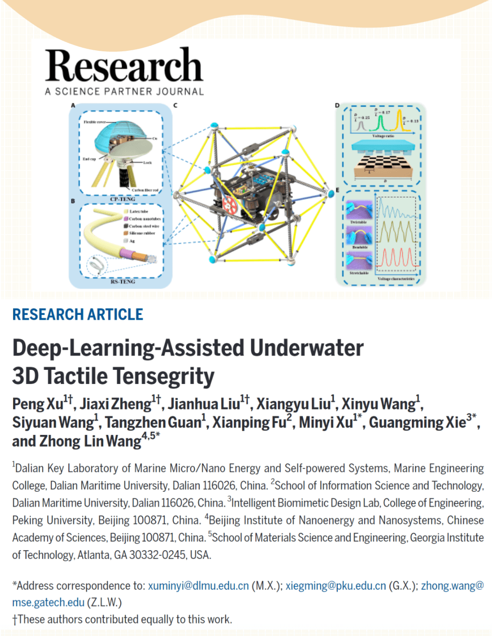 Peng Xu, Jiaxi Zheng, Jianhua Liu, Xiangyu Liu, Xinyu Wang, Jiaxi Zheng, Siyuan Wang, Tianyu Chen, Hao Wang, Chuan Wang, Xianping Fu, Guangming Xie, Minyi Xu and Zhonglin Wang. Deep-Learning-Assisted Underwater 3D Tactile Tensegrity. Research 2023;6:Article 0062. https://doi.org/10.34133/research.0062