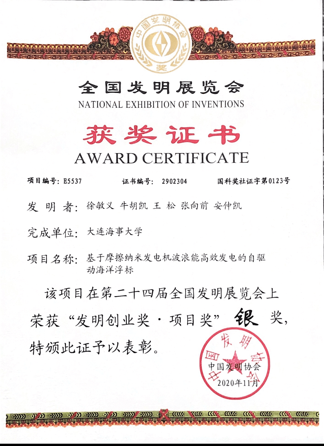 近日,在第二十四届全国发明展览会中,课题组的《基于摩擦纳米发电机波浪能高效发电的自驱动海洋浮标》,荣获“发明创业·项目奖”银奖。