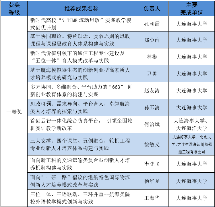 - 近日,辽宁省教育厅公布2022年辽宁省普通高等教育(本科)教学成果奖获奖名单,大连海事大学21项教学成果入选。其中一等奖11项、二等奖4项、三等奖6项。一等奖获奖数量首次突破两位数!徐敏义教授作为负责人完成的《三大支撑、四个课堂、五创融合,轮机工程专业创新人才培养体系构建与实践》荣获一等奖。