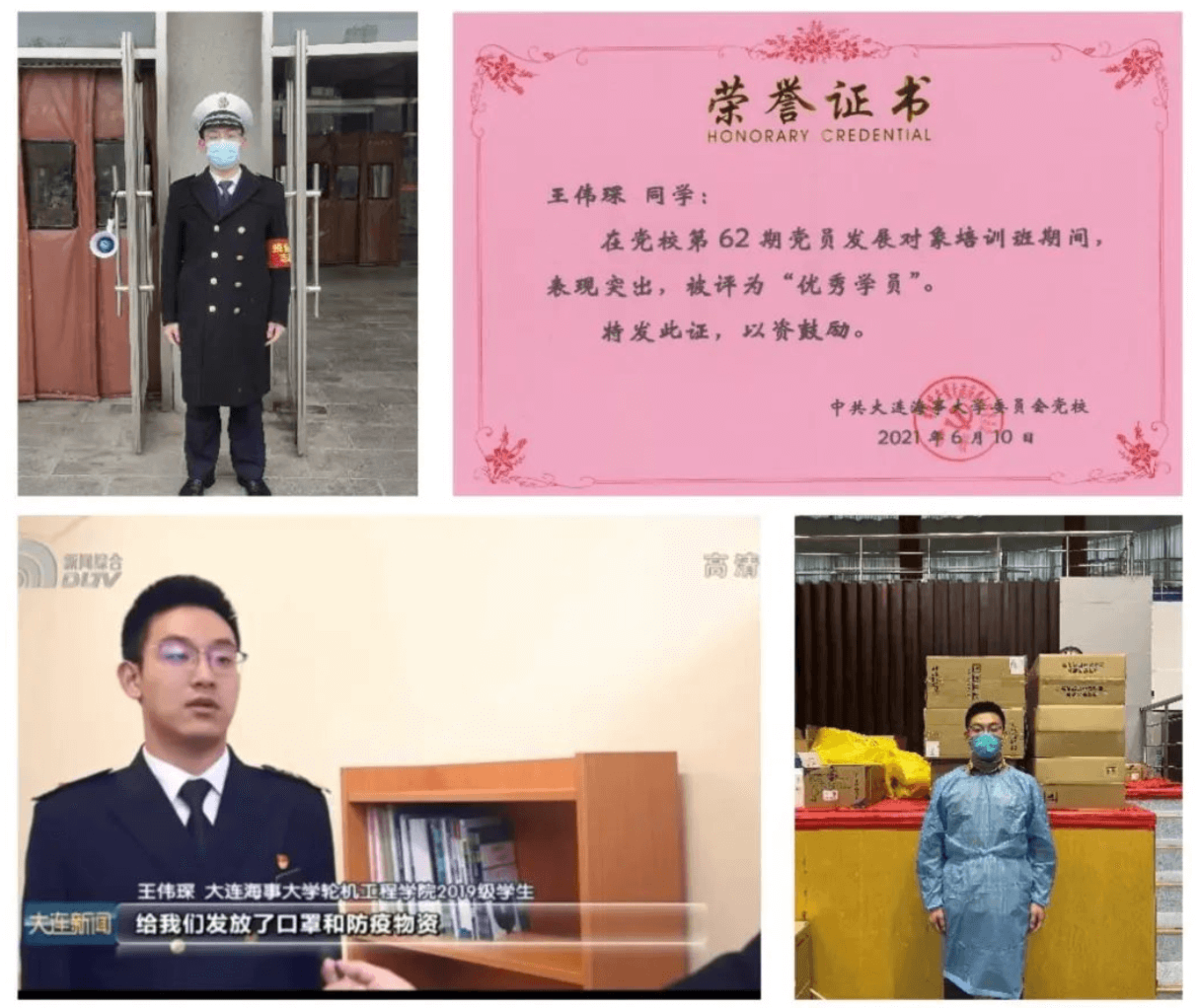 - 自递交入党申请书以来,他始终以党员的标准严格要求自己.积极参加党团活动与志愿服务工作,并入选中队首批中共党员.他也主动参与学校、学院组织的抗疫志愿活动,因表现突出作为学生代表,接受大连电视台的采访。