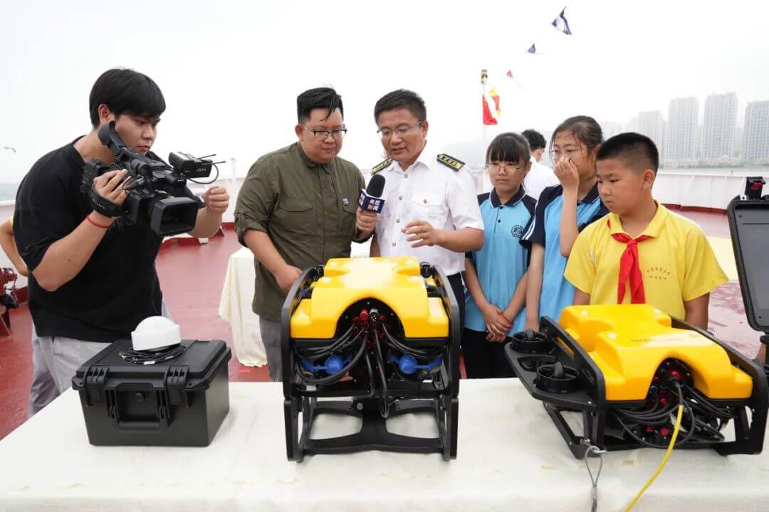 - 轮机工程学院徐敏义教授介绍了机器人海底船底检修项目,并现场操控机器人潜入海底开展船底检测。