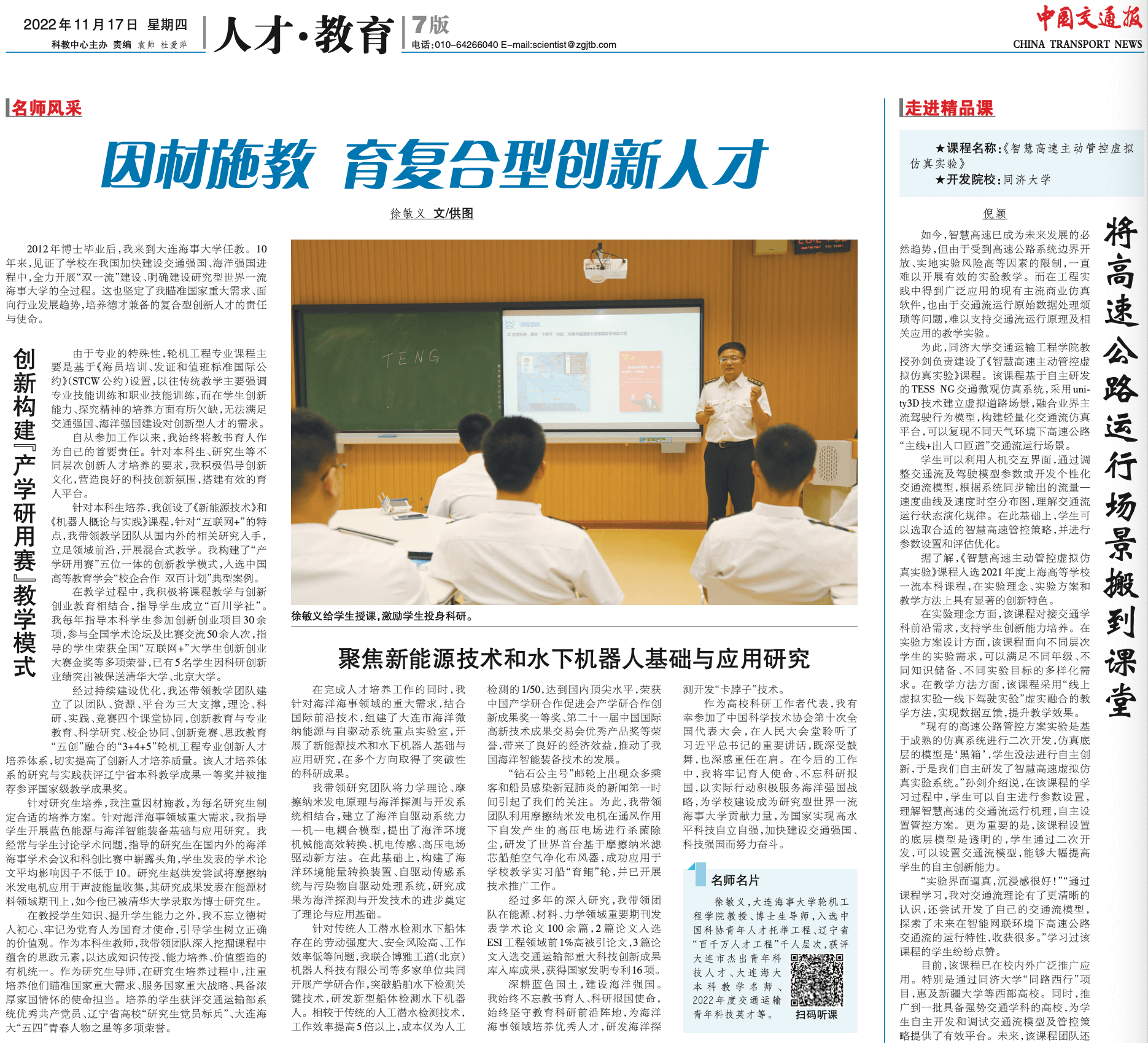 2022年11月17日《中国交通报》名师风采版块报道徐敏义教授:因材施教 育复合型创新人才